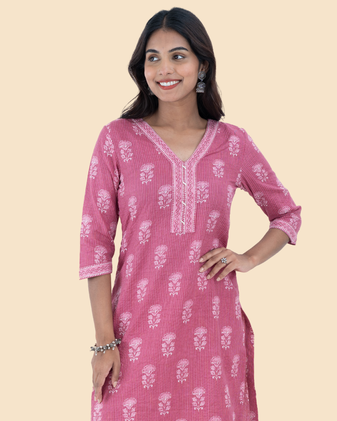 Pink Cotton Kantha Hand Block Printed Long Kurta